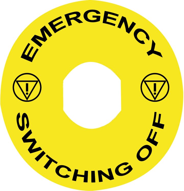 Schneider-Electric ZBY 'NOOD-UIT' etiket, rond 60mm, kleur: geel, tekst: "EMERGENCY SWITCHING OFF", Harmony XB4/XB5 NOOD-UIT functie