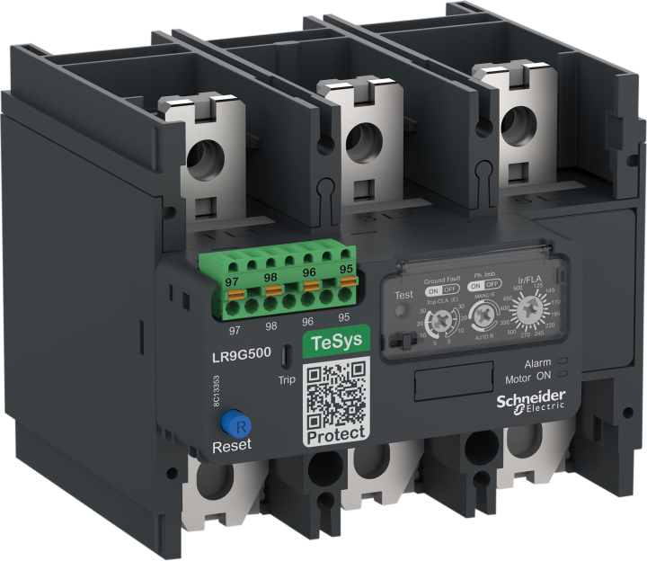 TeSys LR9G 500A thermal overload relay is compatible with TeSys Giga high power contactor, connection by spring. It provides phase imbalance, phase failure, in-built ground-fault and single-phase loads protections. It is available for manual and auto reset options and LED indicator for Motor ON and pre-trip alarm. Tripping classes is selectable from class 5E to class 30E to suit different application needs from fast tripping, general purpose and high inertia loads. It is suitable for independent mounting or direct mounting with LC1G contactors. It provides IP2x protection in Front face with shrouds conforming to IEC 60529 and VDE 0106. It can cover -25°C to 60°C operation ambient air temperature without derating up to 3000m altitude. Multi standards certified (CE,CB,CCC,cULus,EAC,KC,RCM,Marine) and Green Premium compliant (RoHs/Reach). Unique QR code provides quick access to complete product data.