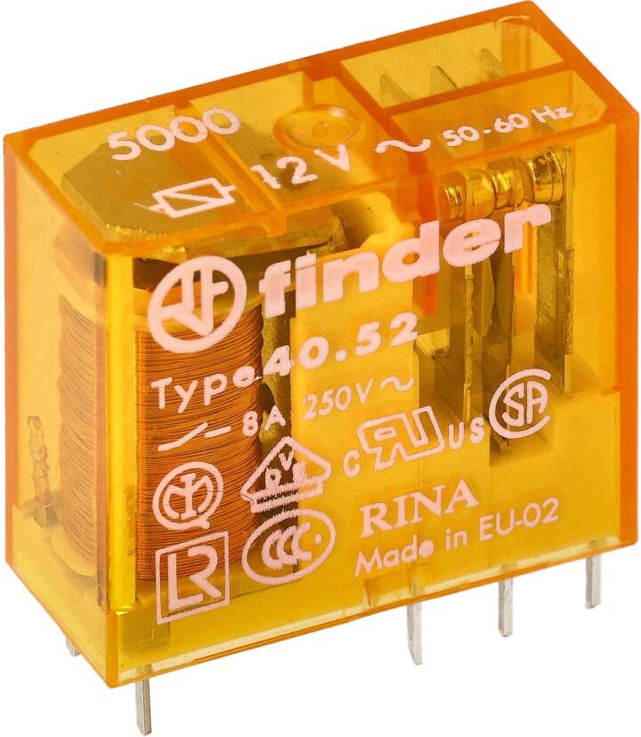 Finder Insteek-/printrelais, raster 5 mm, 2 wisselcontacten 8 A/250VAC, spoelspanning 12 V AC, contact AgNi + Au (5um verguld)