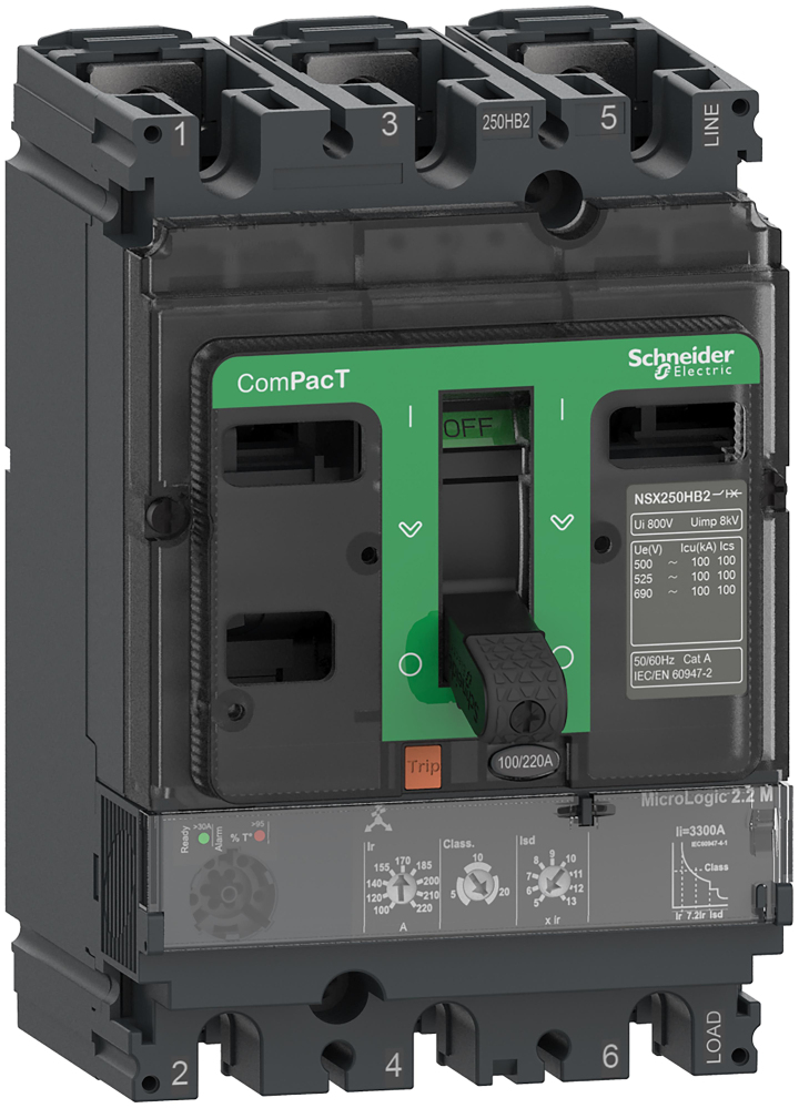 stroomonderbreker ComPacT NSX100HB1, 75 kA bij 690 VAC, MicroLogic 2,2 M uitschakeleenheid 100 A, 3-polig 3d