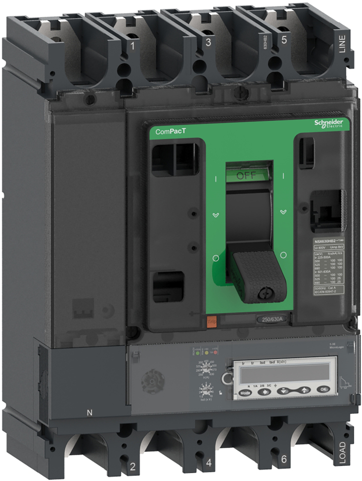 stroomonderbreker ComPacT NSX630R, 200 kA bij 415 VAC, MicroLogic 5.3 E uitschakeleenheid 630 A, 4-polig 4d