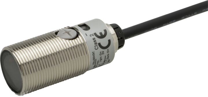 Omron fotocel M18, behuiz. vernikkeld messing, Objectreflectie, detectieafstand 300mm, voeding 10-30V DC, PNP, LO/DO, 2 meter kabel
