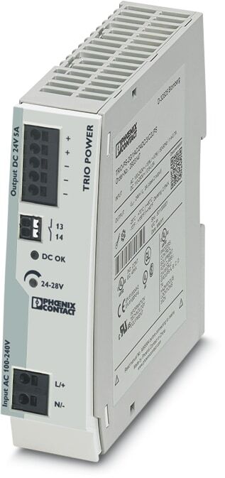 Phoenix Contact, primair geschakelde voeding met push-in-aansluiting voor railmontage, ingang: 1-fase, uitgang: 24 V DC / 5 A