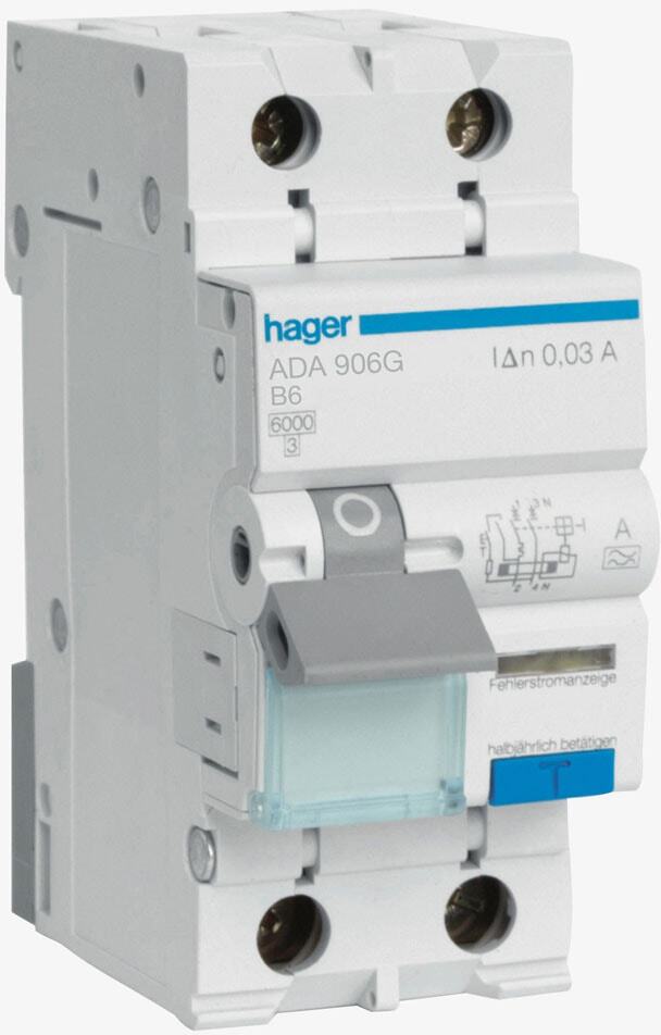 HAGER ADA906G Aardlekautomaat 1P+N 6 Ampere B-KAR 6kA 0,03A 240V 2 MOD