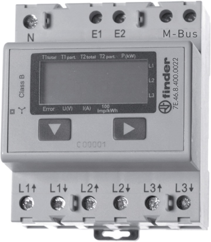 Finder kWh-meter, 3-fase, directe meting, 6A, 230V/400V, klasse B, pulsuitgang, MID, afname, enkeltarief