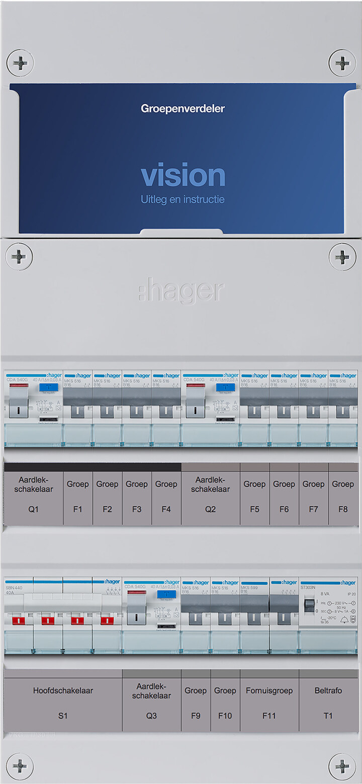Hager Vision installatiekast, 3-fase, 10 groepen, 3 ALS, HS 40A, 4P, 12-mod, 1F-kook, beltrafo, IP30, hxbxd 475x221x89mm