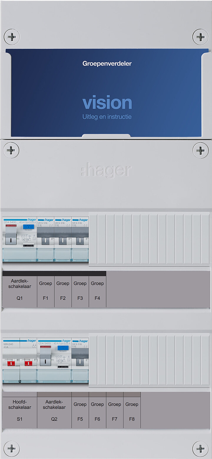 Hager Vision installatiekast, 1-fase, 4 groepen, 2 ALS, HS 40A, 2P, 12-mod, IP30, hxbxd 475x221x89mm