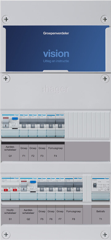 Hager Vision installatiekast, 3-fase, 6 groepen, 2 ALS, HS 40A, 4P, 12-mod, IP30, hxbxd 475x221x89mm