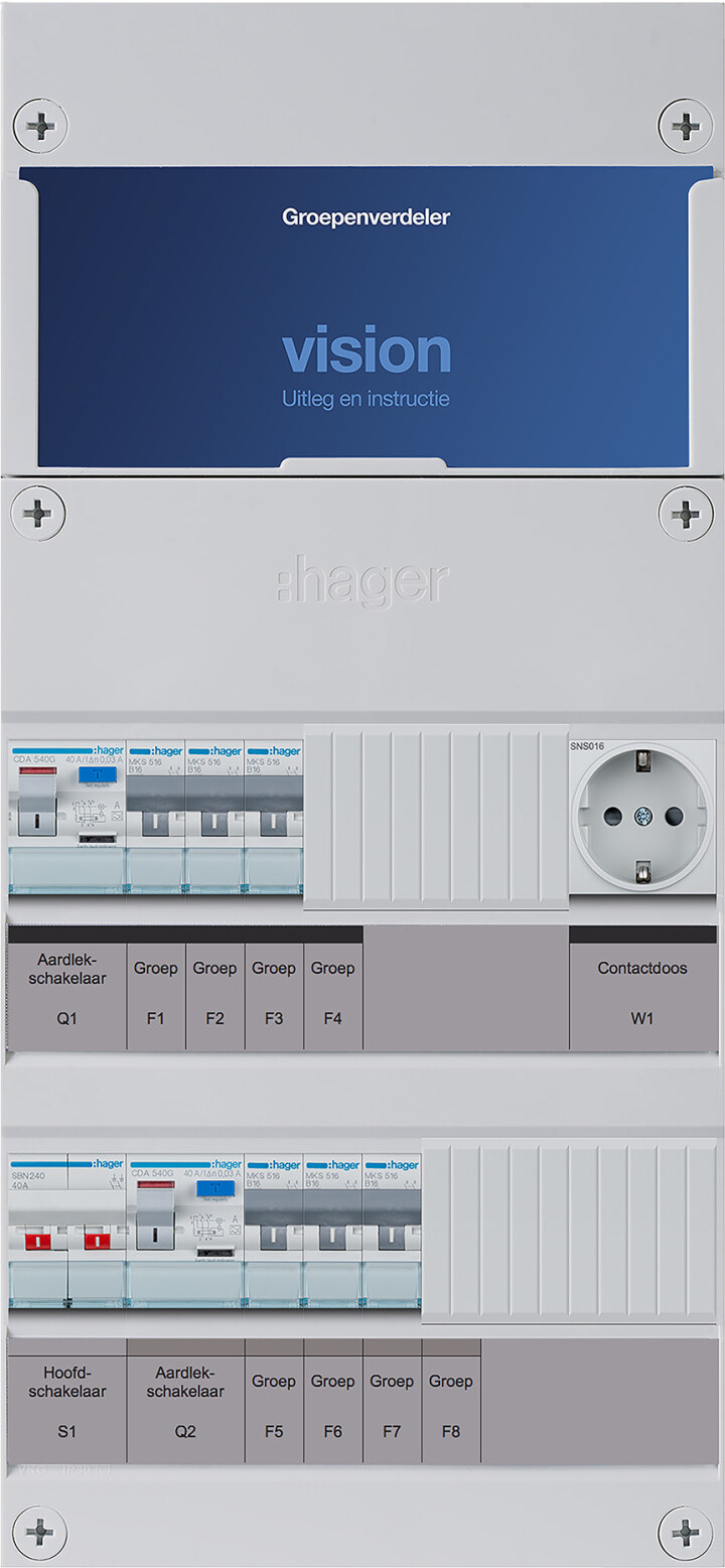 Hager Vision installatiekast, 1-fase, 6 groepen, 2 ALS, HS 40A, 2P, 12-mod, met WCD, IP30, hxbxd 475x221x89mm