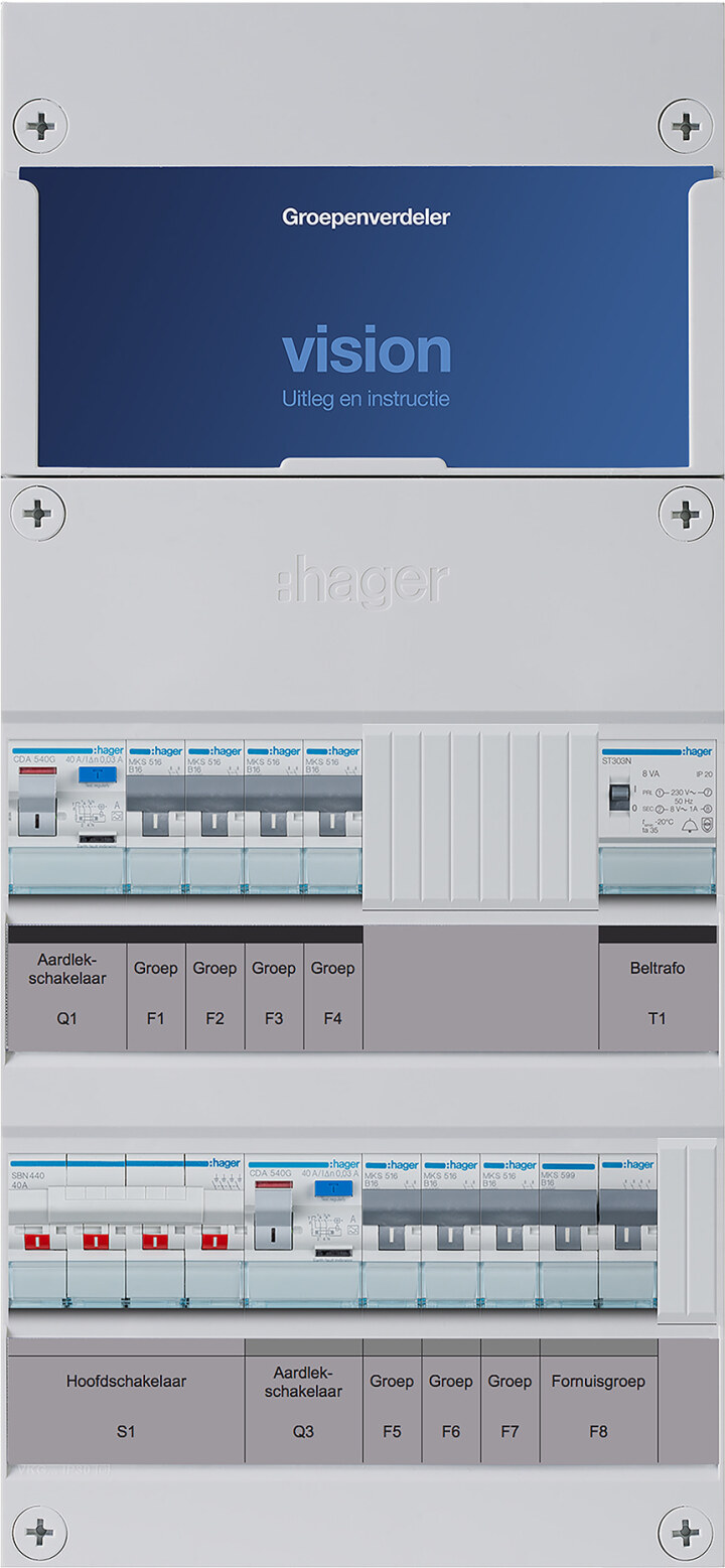Hager Vision installatiekast, 3-fase, 7 groepen, 2 ALS, HS 40A, 4P, 12-mod, 1F-kook, beltrafo, IP30, hxbxd 475x221x89mm