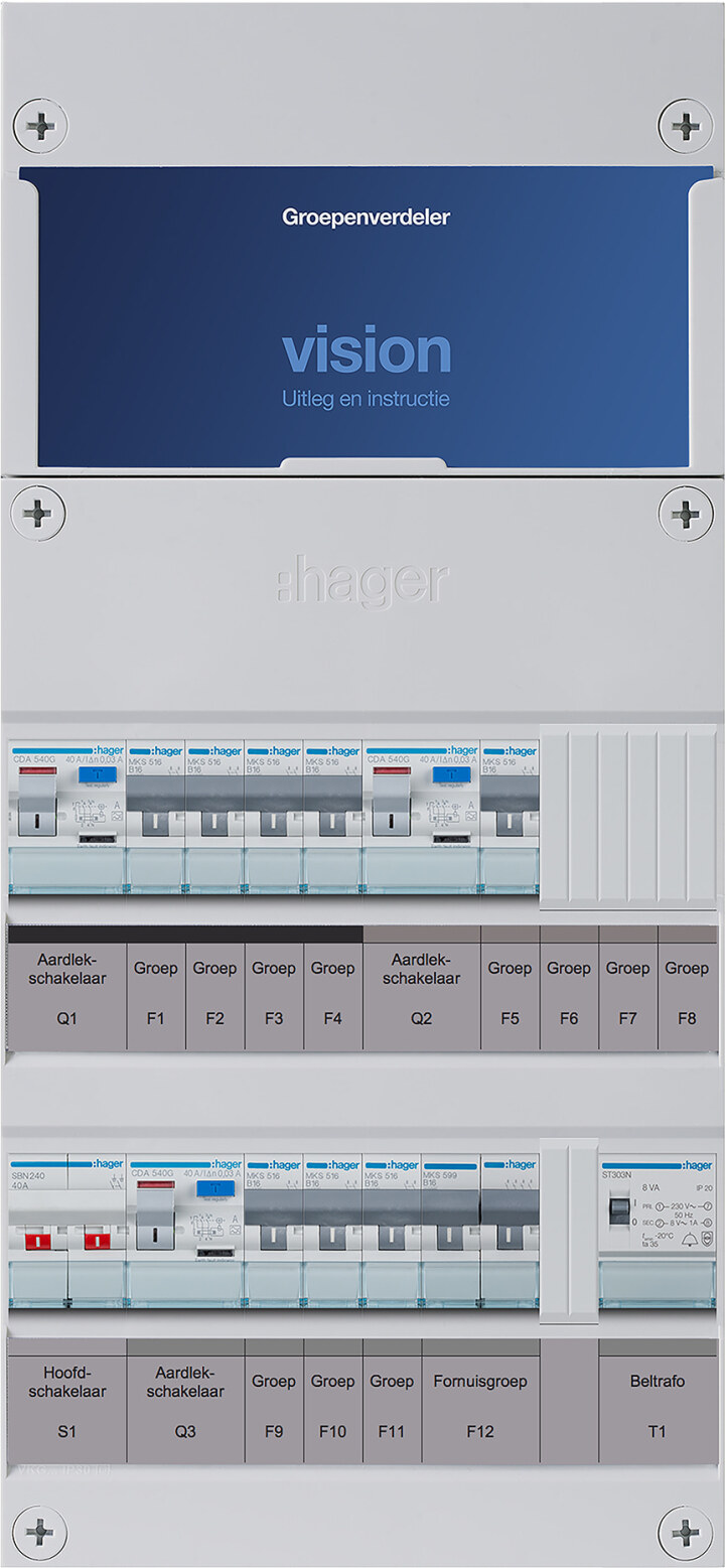 Hager Vision installatiekast, 1-fase, 8 groepen, 3 ALS, HS 40A, 2P, 12-mod, 1F-kook, beltrafo, IP30, hxbxd 475x221x89mm