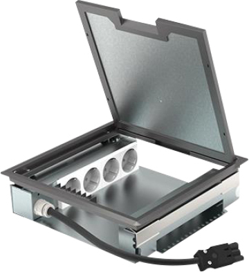HPL vloerdoos instort 80mm - kruisdoos met dubbele bodem - geschikt voor buisleiding Ø19mm en Ø25mm - inbouwdiepte 80mm - inclusief 4x WCD (SCHUKO) en 6x data-uitsparing 15x19.6mm - Kunststof T3 klapdeksel met 3-4mm vloerinleg - draagkracht tenminste 350kg