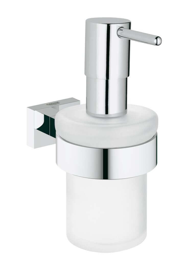 Grohe Essentials Cube, Zeepdispenser met houder, rond, wand, 1-gats, 160ml vulhoeveelheid, metaal/glas, chroom