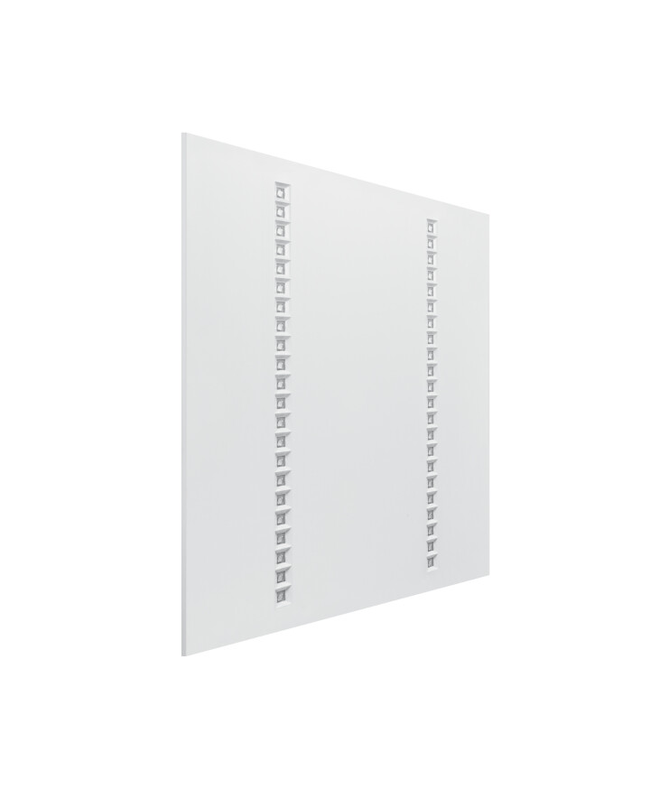 Vierkant inbouwarmatuur met IndiviLED© optiek, 600 mm. Productkenmerken: Levensduur (L80/B50): tot 50.000 uur (bij 25 °C). Metalen behuizing, polycarbonaat (PC) lenzen en reflectoren. Lichtstroom: maximaal 4.000 lm. Lichtopbrengst: tot 120 lm / W. Oorspronkelijke kleurconsistentie: < 4 SDCM. Gloeidraadtest volgens IEC 60695-2-12: 850° C. Productvoordelen: Homogene lichtverdeling en minder verblinding dankzij de IndiviLED©-optiek. Energiebesparing van maximaal 50% (vergeleken met armaturen die fluorescentielampen gebruiken). Robuuste structuur met IK08. Lampje met weinig flikkering dankzij speciaal elektronisch voorschakelapparaat. Andere varianten met DALI E-VSA of noodverlichtingsfunctie volgens IEC 60598-2-22 zijn aanvullend verkrijgbaar. 5 jaar garantie. Toepassingsgebieden: Directe vervanging voor armaturen met fluorescentielampen. Gangen. Kantoren. Vergaderruimten. Receptieruimten. Foyers. Liften. Geschikt voor inbouwplafondsystemen met rastergrootte van 600 x 600 mm. Technische u